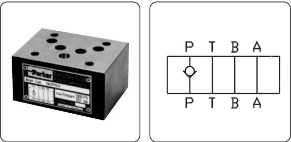Las válvulas check Manapak de la serie CM proveen una válvula check integral de flujo completo en el puerto de presión “P”, puerto “A”, puerto “B” ó el puerto tanque “T” de la válvula direccional. EL flujo inverso esta bloqueado. Los tamaños CM2 y CM3 ofrecen una versión de check de combinación P & T.